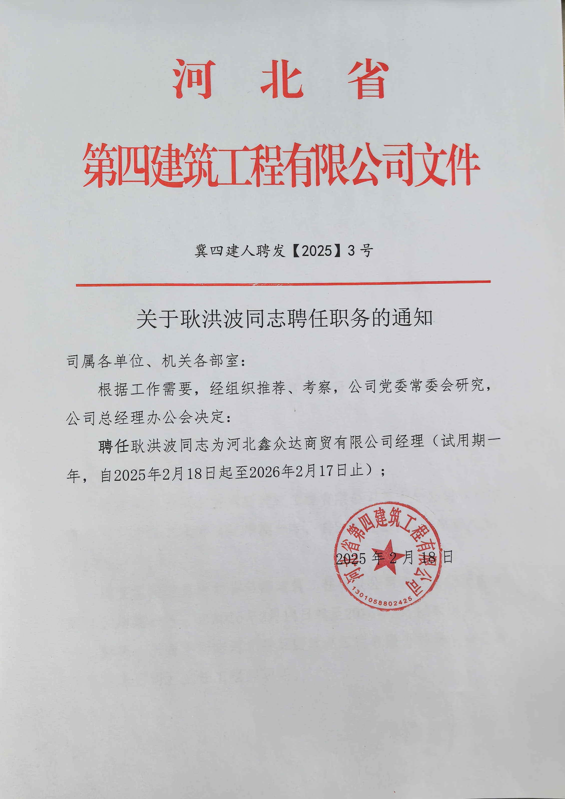 河北四建:关于尹玉石同志聘任职务的通知